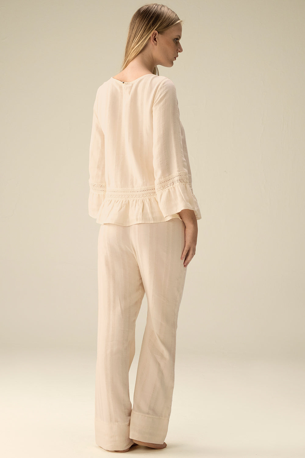 Pants pajama in striped cotton fabric, rounded-neck blouse with long sleeves, hems with ruffles and trim, regular straight-leg trousers. Color ivory, Ref. 0559052