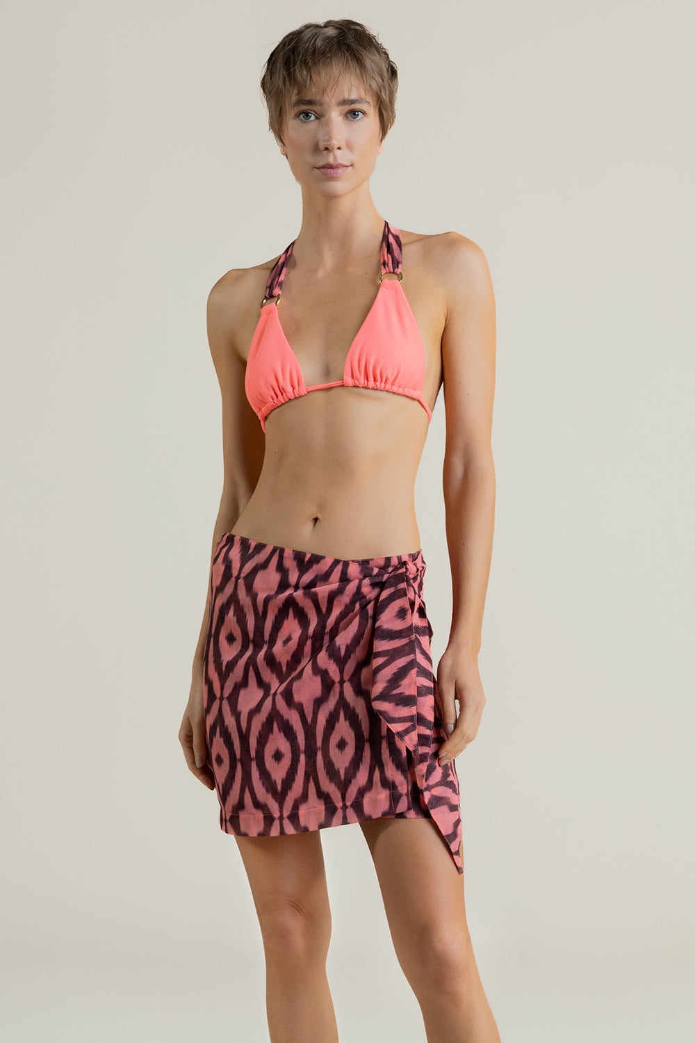 Pareo short skirt in 100% salmon and terracotta print polyester, crossed in front with inner button, adjustable tie straps for a customizable fit, soft and light fabric, coin detail characteristic of our brand with "t" engraved in gold - dipped to avoid oxidation.. Color print