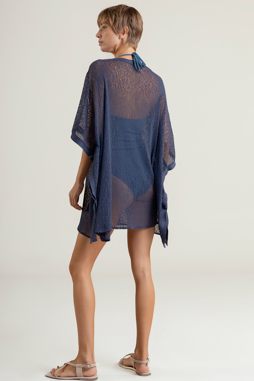Short cover up in net fabric with recycled cotton blend in blue color, poncho style, rib collar and sleeves, coin detail characteristic of our brand with "t" engraved in gold - dipped to avoid oxidation. Color blue, Ref. 0A31A53